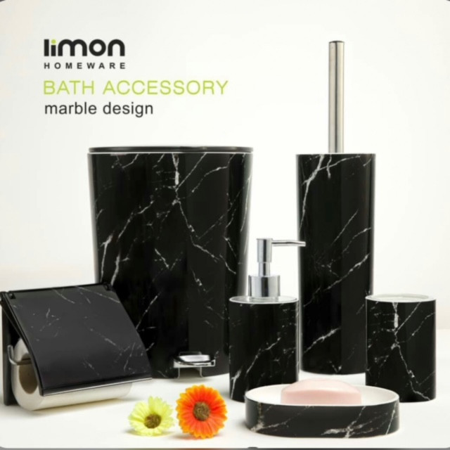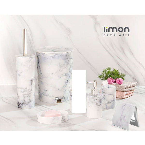 ست سرویس بهداشتی لیمون مدل ماربل مجموعه 6 عددی می باشد که شامل یک عدد جای دستمال کاغذی رولی دیواری به طول مربع 13 سانتی متر و یک عدد سطل به ابعاد قطر: 24 سانتی متر و ارتفاع: 27 سانتی متر و حجم: 4.5 لیتر می باشد . و یک عدد فرچه به قطر: 10 سانتی متر و ارتفاع: 39 سانتی متر و جامایعی به قطر: 7.5 سانتی متر و ارتفاع: 17 سانتی متر است.. همچنین دارای یک عدد جامسواکی به قطر: 10.5 ارتفاع: 7.5 سانتی متر و جاصابونی به عرض: 10 طول: 14.5 ارتفاع: 3 سانتی متر می باشد.