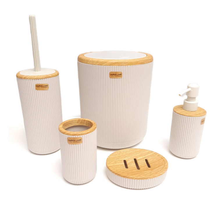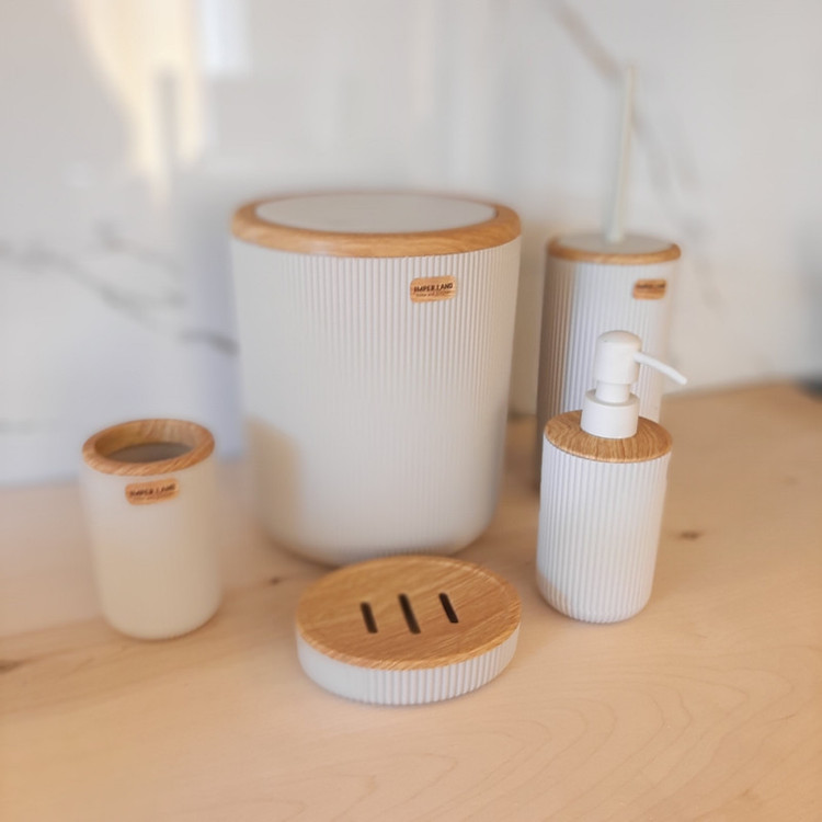 توضیحات ابعاد: سطل ذباله به ارتفاع ۲۵ سانت قطر ۲۰ برس ارتفاع ۳۵ سانت قطر ۱۰ محفظه مسواک ارتفاع ۱۳ قطر ۸ جای صابونی طول ۱۴ سانت عرض ۱۱ سانت و ارتفاع ۴ سانت جای مایع ارتفاع ۱۹ قطر ۸ سانت