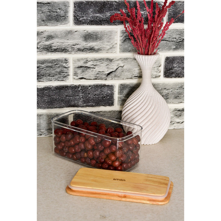 بانکه مستطیل درب چوبی لیمون، بدنه این بانکه از جنس اکریلیک و درب آن چوبی است. مناسب استفاده جهت نگهداری انواع حبوبات و… می باشد. نوار سیلیکونی دور درب از ورود هوا به داخل ظرف جلوگیری می کند.