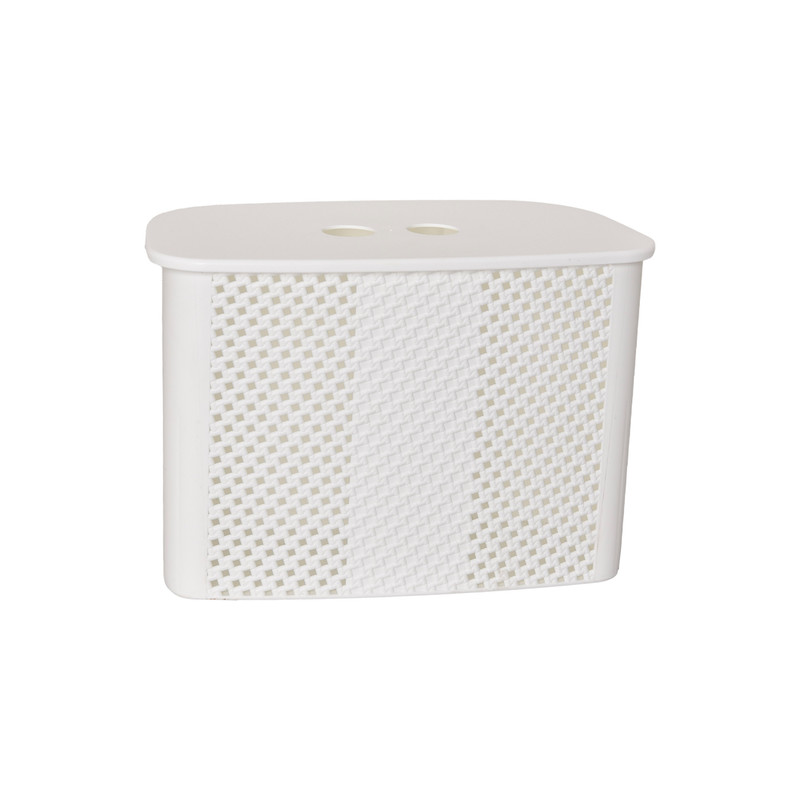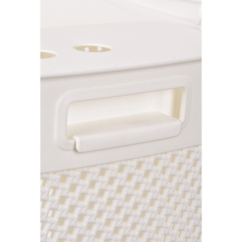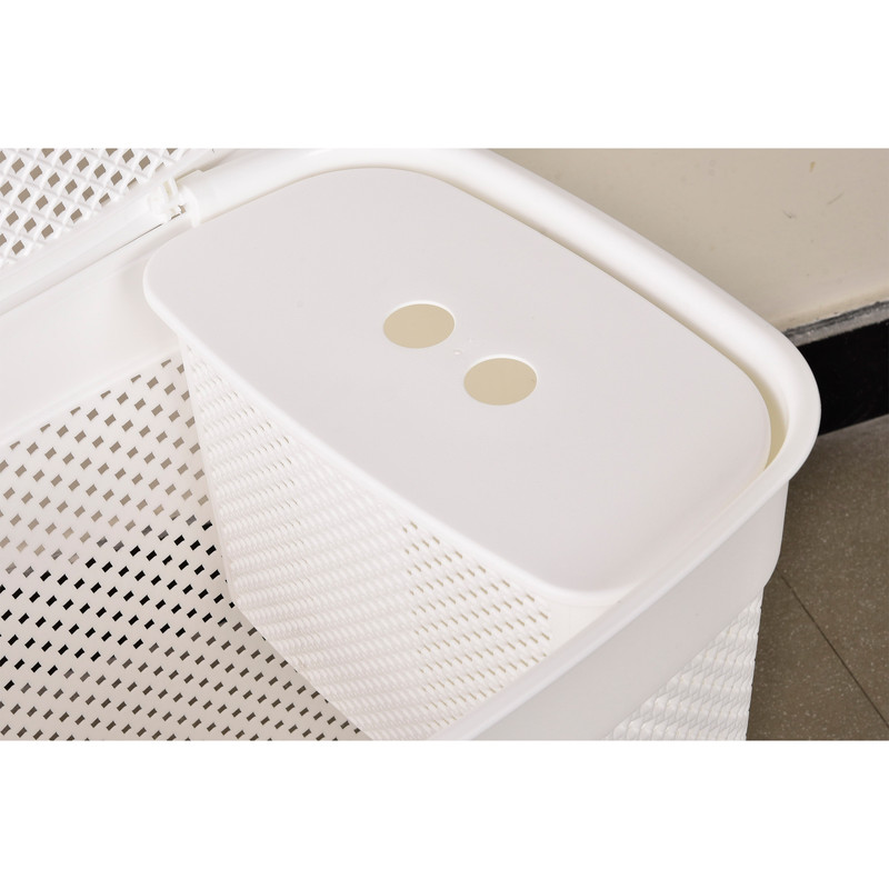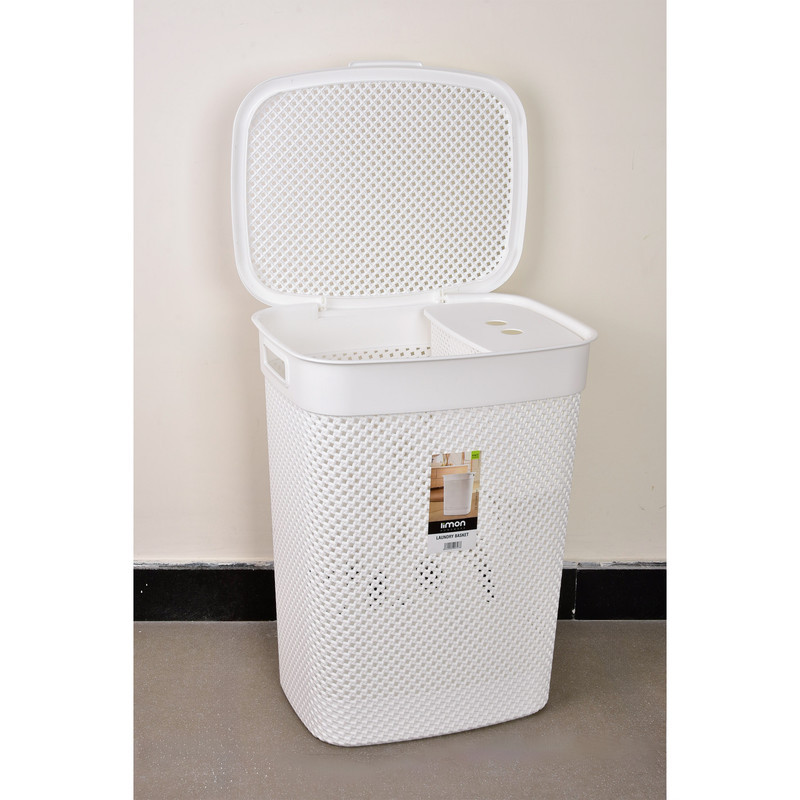 این سبد دارای یک ویژگی متمایز است یک سطل یا مخزن داخلی قابل جدا شدن دارد که حمل لباسهای چرک تا ماشین لباسشویی را آسان میکند و به تمیز نگه داشتن خود سبد اصلی کمک میکند. این سبد با طراحی مستطیلی و بافت طرح حصیر، ظاهری مدرن دارد و مجهز به درب است تا محتویات داخل آن دیده نشود. جنس سبد از پلاستیک با کیفیت و مقاوم ساخته شده و بدنه آن برای جریان هوا و جلوگیری از بوی نامطبوع دارای منافذ است.