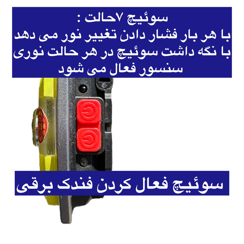 این چراغ قوه چند کاره را می توانید به عنوان جاسوئیچی استفاده کرده و یا آن را به کیفتان وصل کنید. با فشردن دکمه خاموش و روشن آن برای مرتبه اول نور چراغ مرکزی با شدت زیاد _ مرتبه دوم نور چراغ مرکزی با شدت کم _ در مرتبه سوم نور چراغ مرکزی بصورت چشمک زن _ در مرتبه چهارم نور COB با شدت زیاد _ در مرتبه پنج نور COB با شدت کم _ در مرتبه ششم نور آبی _ در مرتبه هفتم نور قرمز و آبی بصورت چشمک زن دریافت خواهید کرد . و با نگه داشتن سوئیچ در هر حالت روشنایی سنسور حرکتی فعال میشود
