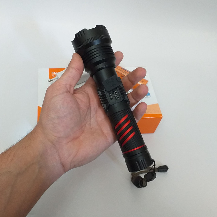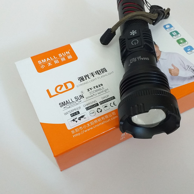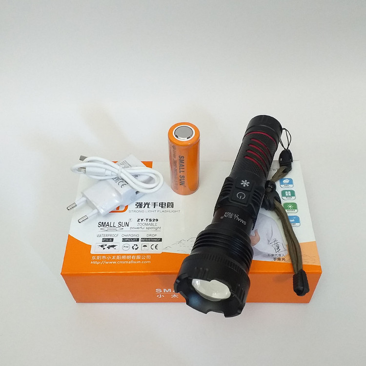 چراغ قوه شارژی اسمال سان SMALL SUN سِری تی اس (TS) نسل جدید چراغ قوه های کمپانی معتبر اسمال سان با تکنولوژی لامپ های نسوزِ جدید P90 که تا 1500 متر قدرت پرتاب نور بصورت نقطه زن را داراست و در 3 حالت: نور زیاد / نور کم / نور چشمک زن روشن میشود همچنین در سمت چپ چراغ قوه لامپ SMD تعبیه شده که میتواند براحتی یک چادر چهار نفره را روشن کند و در 2 حالت: نور زیاد و نور کم روشن میشود و نیز در سمت راست چراغ قوه لامپ فلشر تعبیه شده که در 3 حالت: ثابت قرمز / چشمک زن قرمز و رقص نور چند رنگ روشن میشود و در مواقع اضطراری برای علامت دادن یا هدایت گروه بسیار کاربردی است ، از دیگر ویژگی های منحصر به فرد این چراغ قوه مدار بسیار قدرتمند آن است دارای خروجی USB بوده و در مواقع ضروری همانند یک پاوربانک میتواند گوشی موبایل را برای دو الی سه تماس اضطراری شارژ کند و با هر دو باتری سایز 26650 و 18650 کاملا سازگار است ، بدنه چراغ قوه نیز از آلیاژ آلومینیوم سخت با پوشش رنگ کوره ای ساخته شده و در مقابل شوک های شدید مقاومت بالایی دارد همچنین کاملا در مقابل برف و باران و پاشش آب مقاوم است و در هر نوع شرایط جوی و محیطی میتوان از چراغ قوه اسمال سان TS29 استفاده کرد .