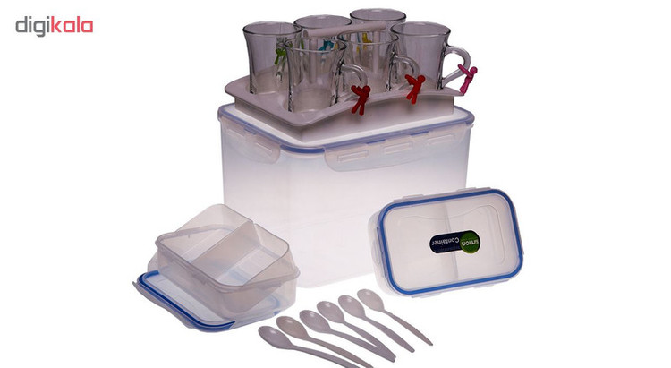 شامل: - 6 عدد لیوان با ابعاد 10*7 - 6 قاشق با ارتفاع 13 سانتی متر - ابعاد ظروف داخلی : 5*11*18