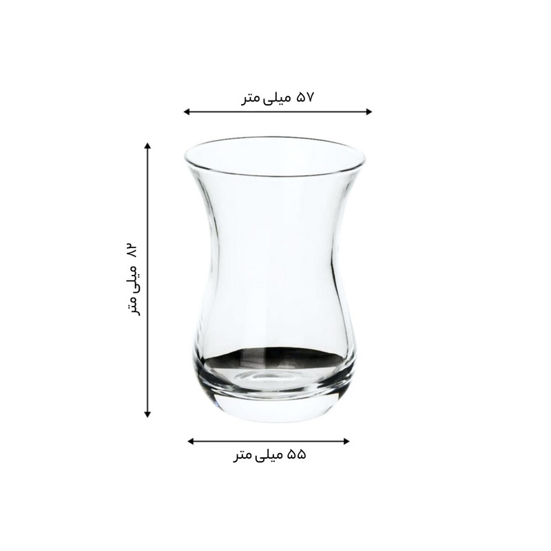- قطر دهانه استکان 57 میلیمتر - قطر پایین استکان 38 میلیمتر - ارتفاع استکان 83 میلیمتر