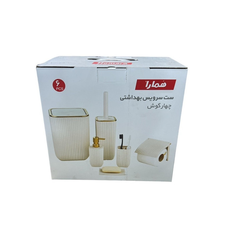 شامل 1 عدد سطل 1 عدد فرچه سرویس بهداشتی 1 عدد جا دستمال کاغذی دیواری 1 عدد جا صابون 1 عدد جا مایع و یک عدد جای خمیردندان و مسواک