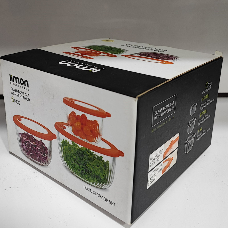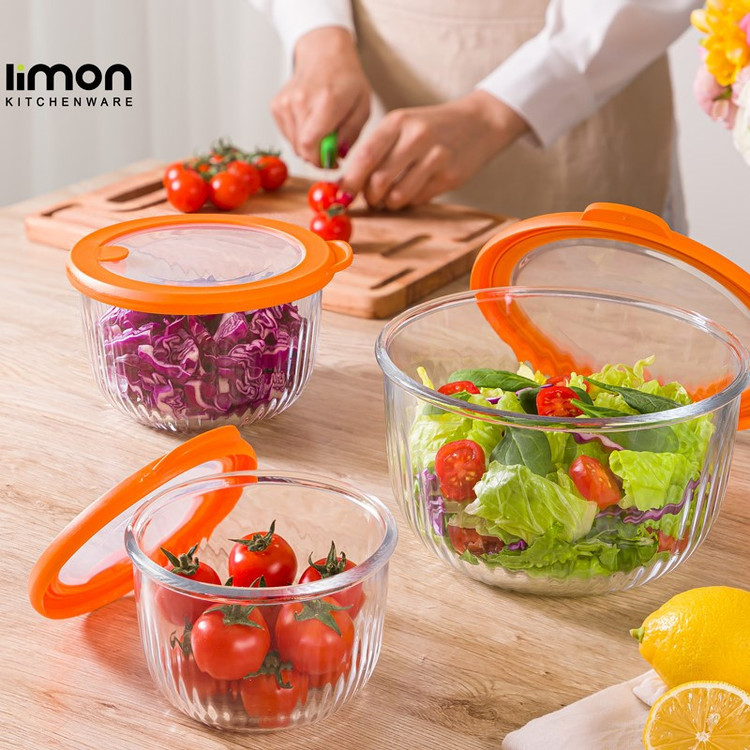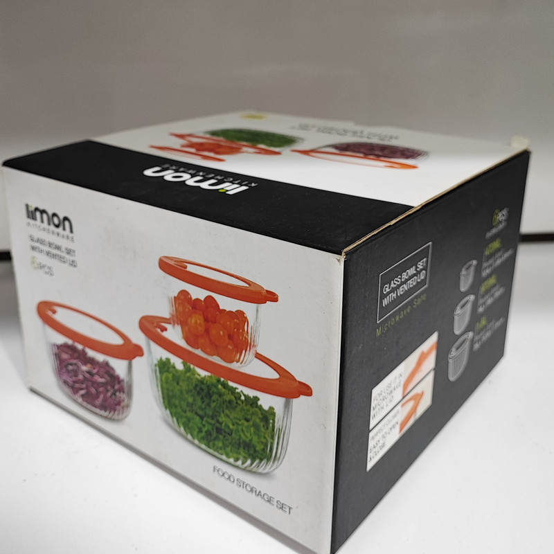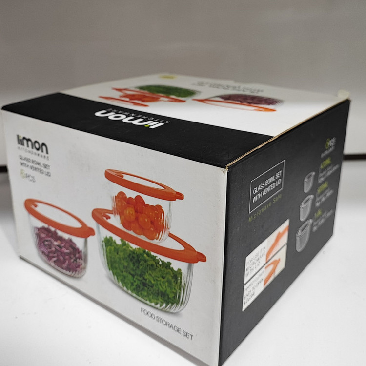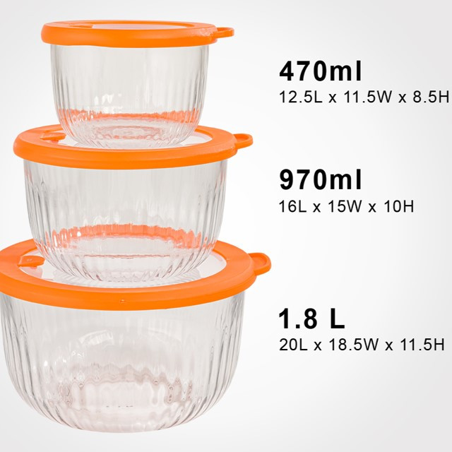 سه عدد ظرف با ابعاد مختلف میباشد که از جنس شیشه ای و پلاستیک با کیفیت ساخته شده است. : سایز 1 با قطر 20 و ارتفاع 11.5 سانتیمتر و ظرفیت 1.8 لیتر، سایز 2 با قطر 16 و ارتفاع 10 سانتیمتر.